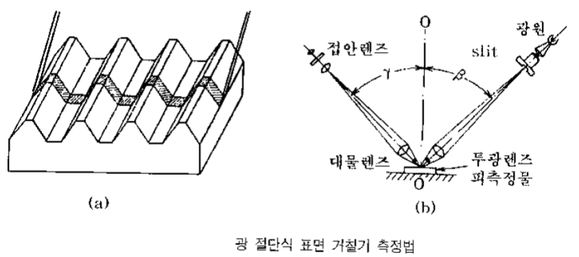그림과 같이 피측정물의 방향에 수직인 방향에 대하여 β쪽에서 좁은 틈새로 나온 빛을 투과하여 광선으로 표면을 절단하여 γ방향에서 현미경이나 투영기에 의해서 확대하여 관측하거나 촬영하여 요철의 상태를 알아내는 방법이다.